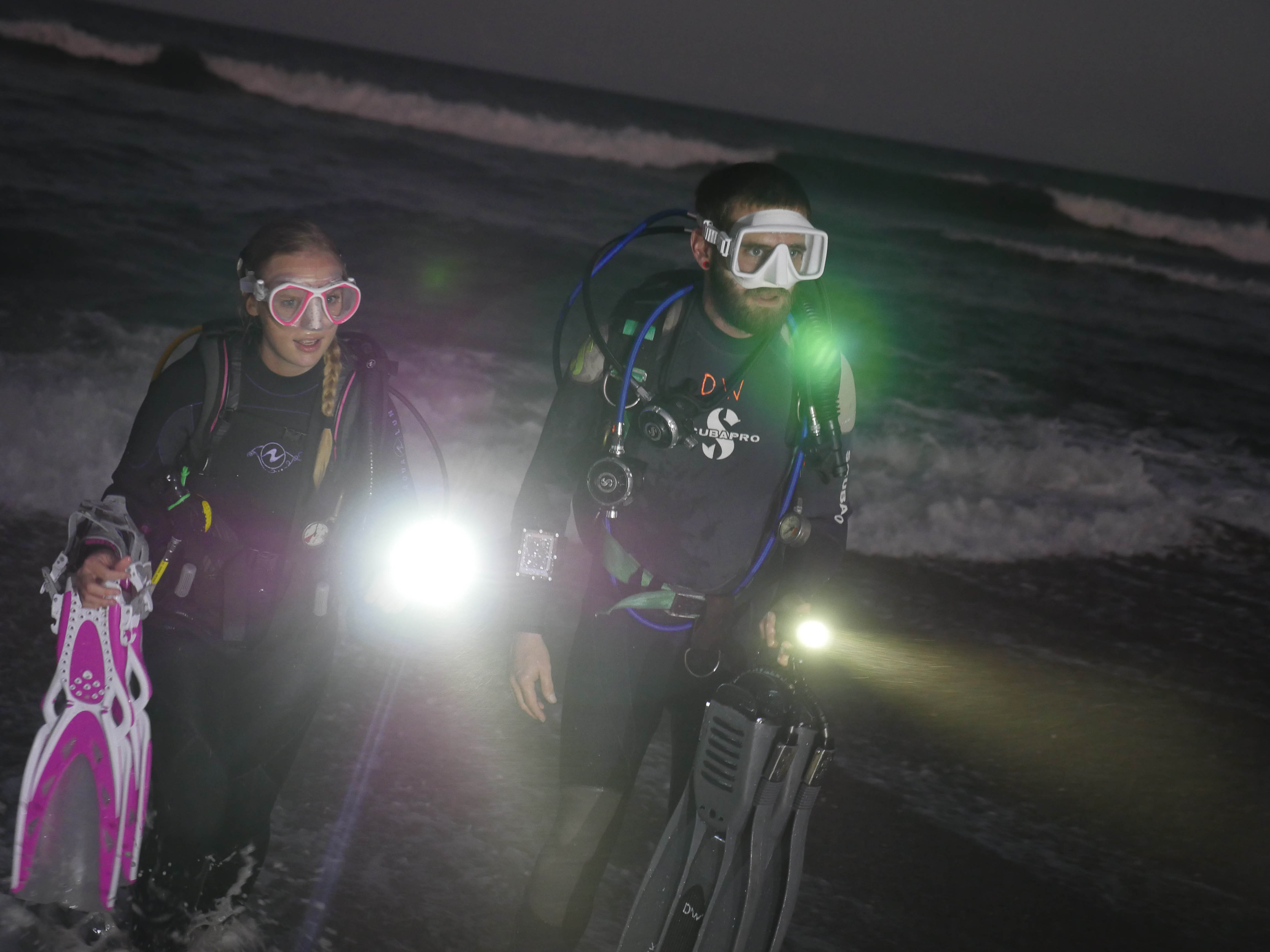 Dive 1: Practice light handling, buoyancy control, and buddy communication techniques in a low-light environment.